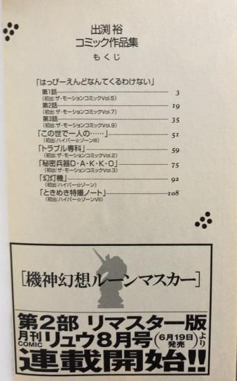 「ザ・モーションコミック」「ハイパー☆ゾーン」に掲載された出渕裕漫画(ほぼメカ・SF的要素は登場しない)を5作+設定ノート的なものを収録。
